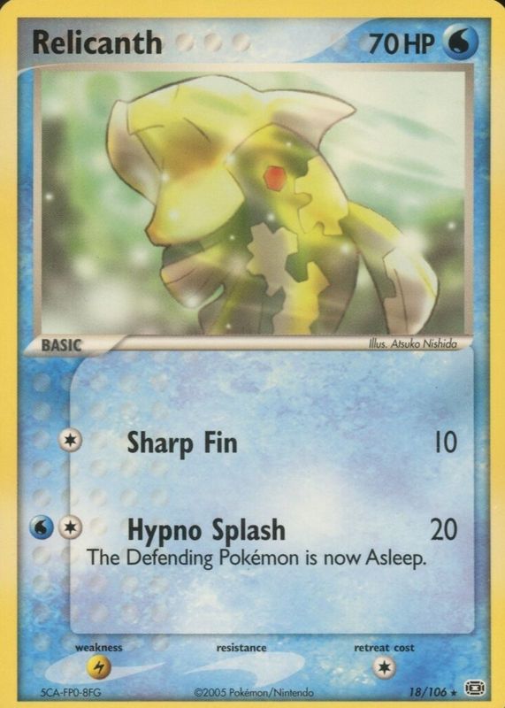 The Relicanth 2005 EX: Emerald #018/106 Base card in Raw TCG (Near Mint) condition has not changed in price in the last 30 days and was last sold for $2.99 .