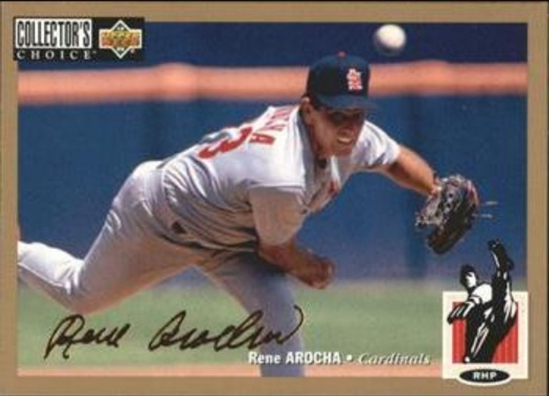 The Rene Arocha 1994 Upper Deck Collector's Choice #41 Gold Signatures card is 1 of 3 Rene Arocha's card variations in the 1994 Upper Deck Collector's Choice set being tracked by Sports Card Investor, including Base, and Silver Signatures.