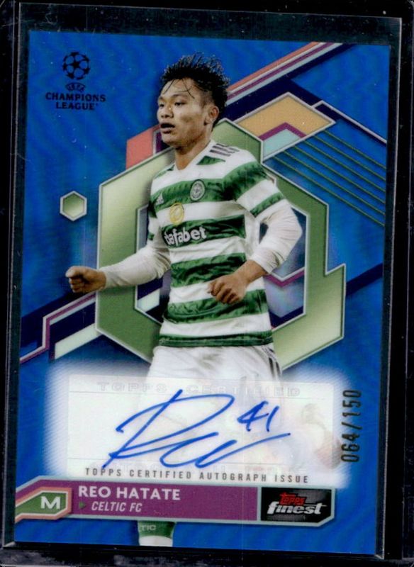 The Reo Hatate 2022 Topps Finest UEFA Club Competitions #A-RH Autographs - Blue Refractor /150 Rookie card is 1 of 28 Reo Hatate's card variations in the 2022 Topps Finest UEFA Club Competitions set being tracked by Sports Card Investor, including Base, Refractor, Purple Refractor /299, Sky Blue Refractor /275, and Blue Aqua Vapor Wave Refractor /250.