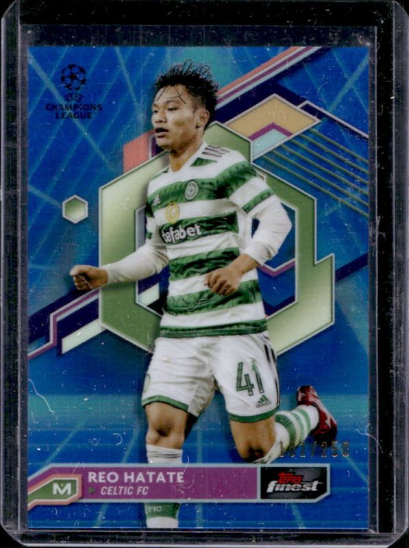 The Reo Hatate 2022 Topps Finest UEFA Club Competitions #69 Blue Aqua Vapor Wave Refractor /250 Rookie card is 1 of 28 Reo Hatate's card variations in the 2022 Topps Finest UEFA Club Competitions set being tracked by Sports Card Investor, including Base, Refractor, Purple Refractor /299, Sky Blue Refractor /275, and Purple Shimmer Refractor /199.