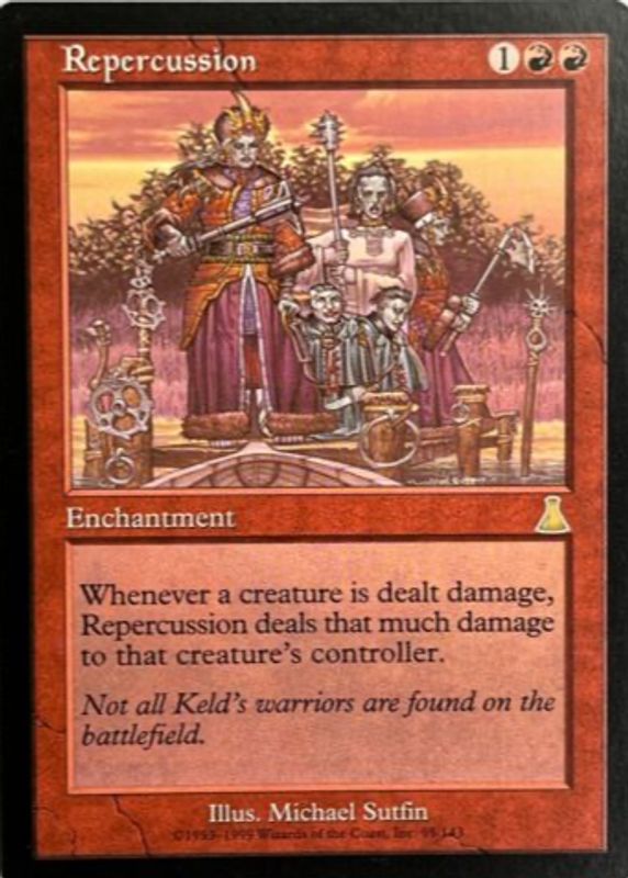 The Repercussion 1999 Urza's Destiny #95 Base card in Raw TCG (Near Mint) condition has moved down -$2.03 (-13.4%) in the last 30 days and was last sold for $13.07 .