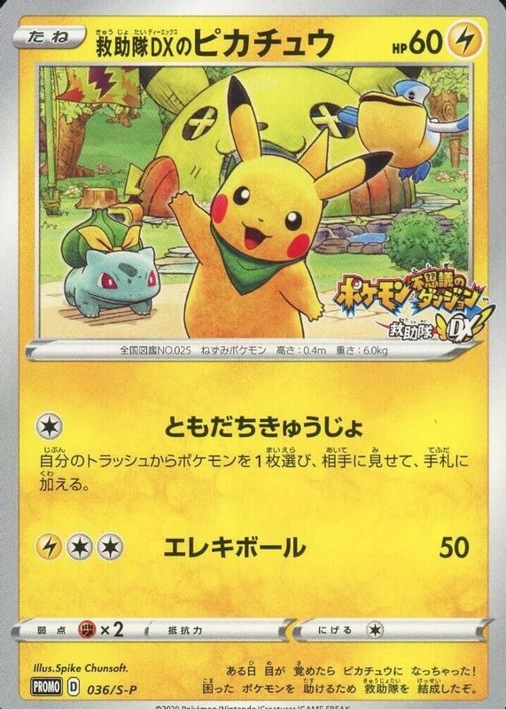 The Rescue Team DX's Pikachu 2020 Japanese S-P Promo #036/S-P Mystery Dungeon Purchase Campaign card in Raw TCG (Near Mint) condition has not changed in price in the last 30 days and was last sold for $58.50 .