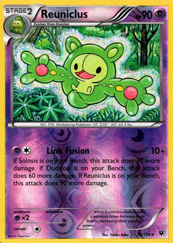 The Reuniclus 2016 XY: Fates Collide #035/124 Reverse Holo card in Raw TCG (Lightly Played) condition has not changed in price in the last 30 days and was last sold for $0.99 .