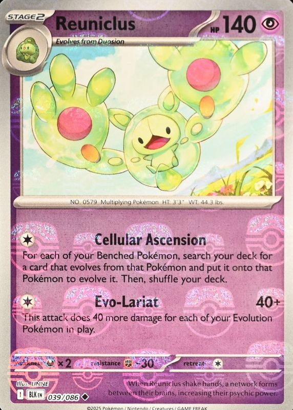 The Reuniclus 2025 Scarlet & Violet: Black Bolt #039/086 Master Ball Reverse Holo card in Raw TCG (Near Mint) condition has moved down -$1.26 (-18.0%) in the last 30 days and was last sold for $5.74 .