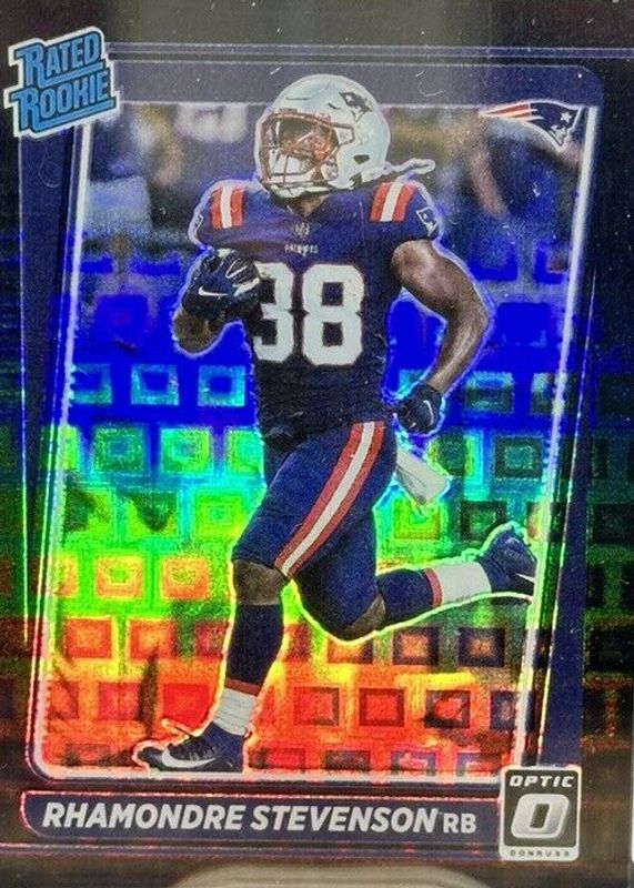 This card is 1 of 52 Rhamondre Stevenson's card variations in the 2021 Optic set being tracked by Sports Card Investor, including Base, Blue Hyper, Blue Scope, Bronze, and Green Velocity.
