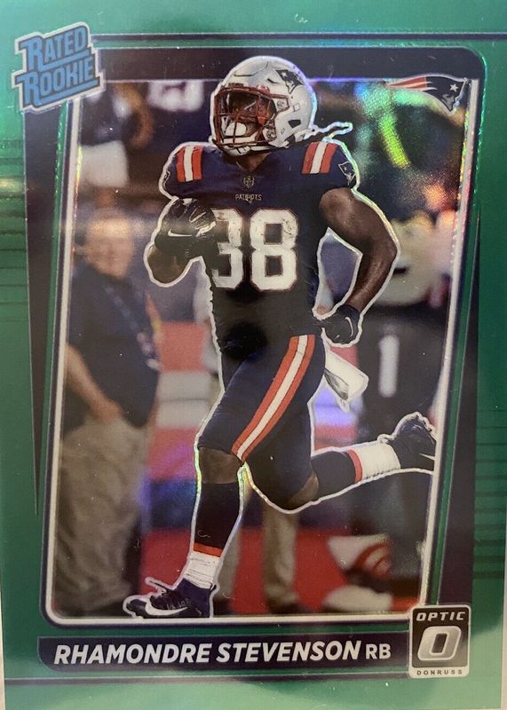 The Rhamondre Stevenson 2021 Optic #237 Green /5 Rookie card in Raw condition has not changed in price in the last 30 days and was last sold for $91.00 .