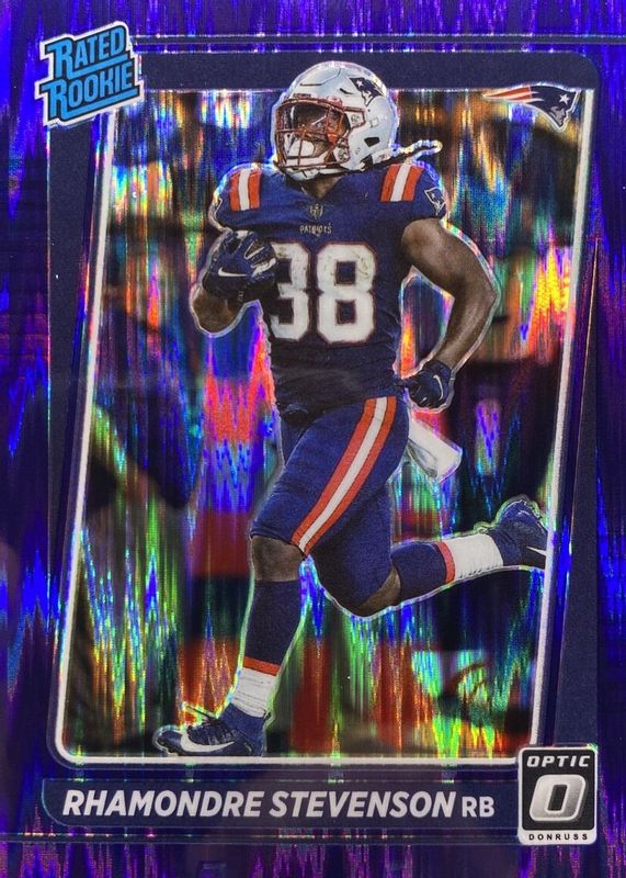 The Rhamondre Stevenson 2021 Optic #237 Purple Shock Rookie card in Raw condition has moved up $7.29 (+270%) in the last 30 days and was last sold for $9.99 .