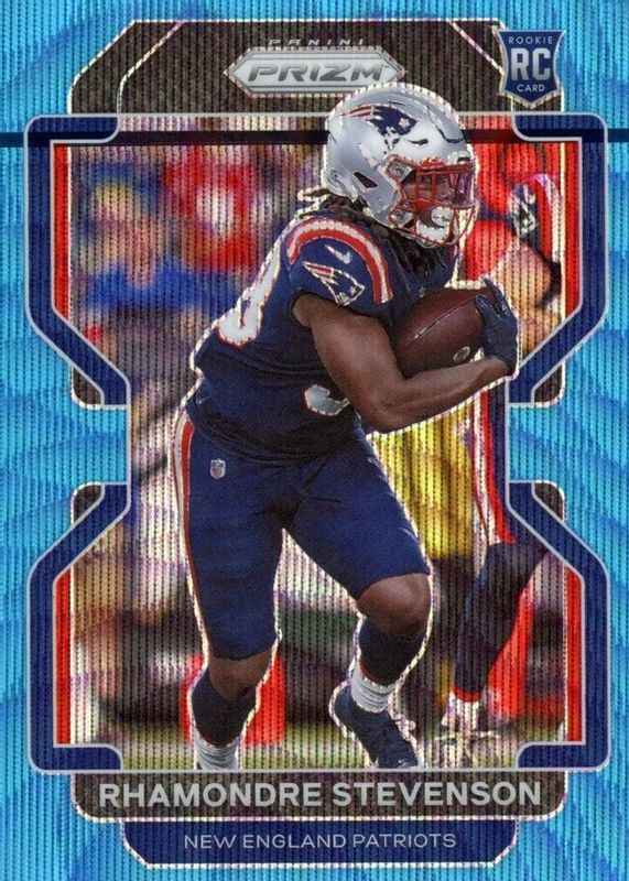 The Rhamondre Stevenson 2021 Prizm #367 Blue Wave /199 Rookie card in Raw condition has not changed in price in the last 30 days and was last sold for $4.10 .