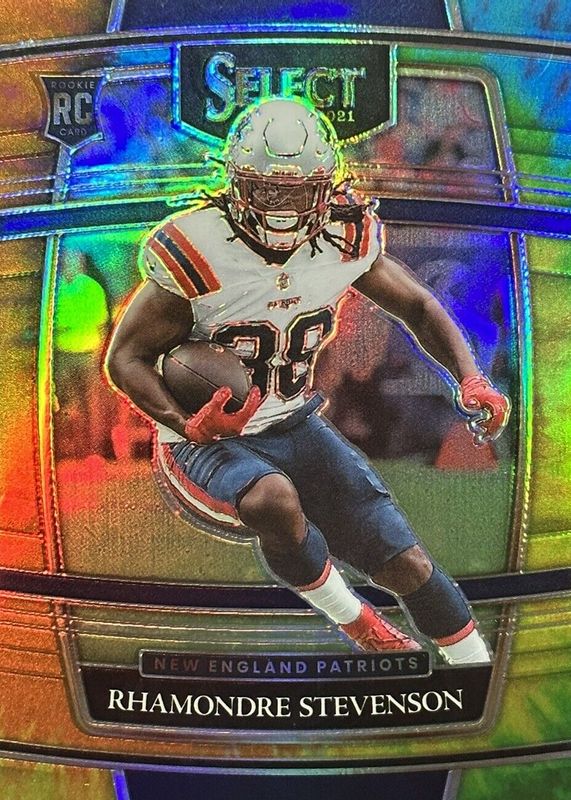 This card is 1 of 131 Rhamondre Stevenson's card variations in the 2021 Select set being tracked by Sports Card Investor, including Club Level, Concourse, Field Level, Premier Level, and Club Level Black & Gold Die-Cut.