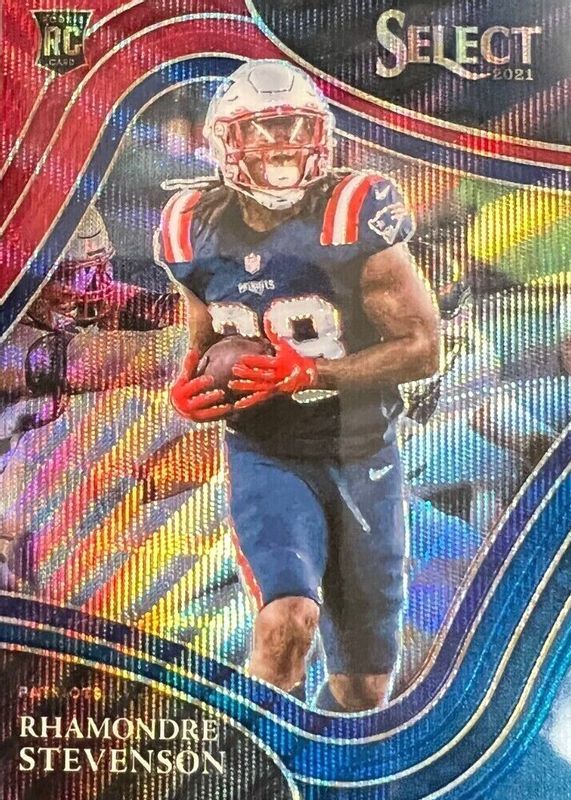 This card is 1 of 131 Rhamondre Stevenson's card variations in the 2021 Select set being tracked by Sports Card Investor, including Club Level, Concourse, Field Level, Premier Level, and Club Level Black & Gold Die-Cut.