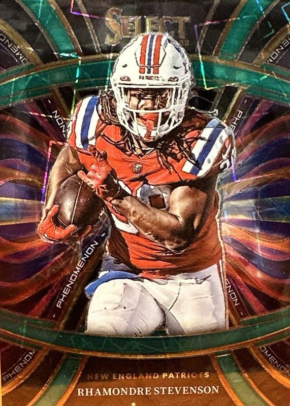 The Rhamondre Stevenson 2022 Select #PHE-10 Phenomenon - Green /5 card in Raw condition has not changed in price in the last 30 days and was last sold for $21.50 .