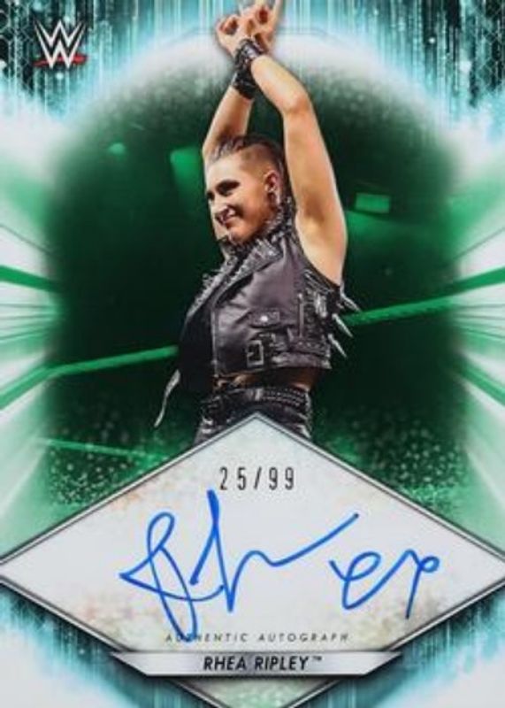 The Rhea Ripley 2021 Topps WWE #A-RH Autographs - Green /99 card is 1 of 37 Rhea Ripley's card variations in the 2021 Topps WWE set being tracked by Sports Card Investor, including Base, Bronze, Foilboard, Light Green /199, and Citrine /75.