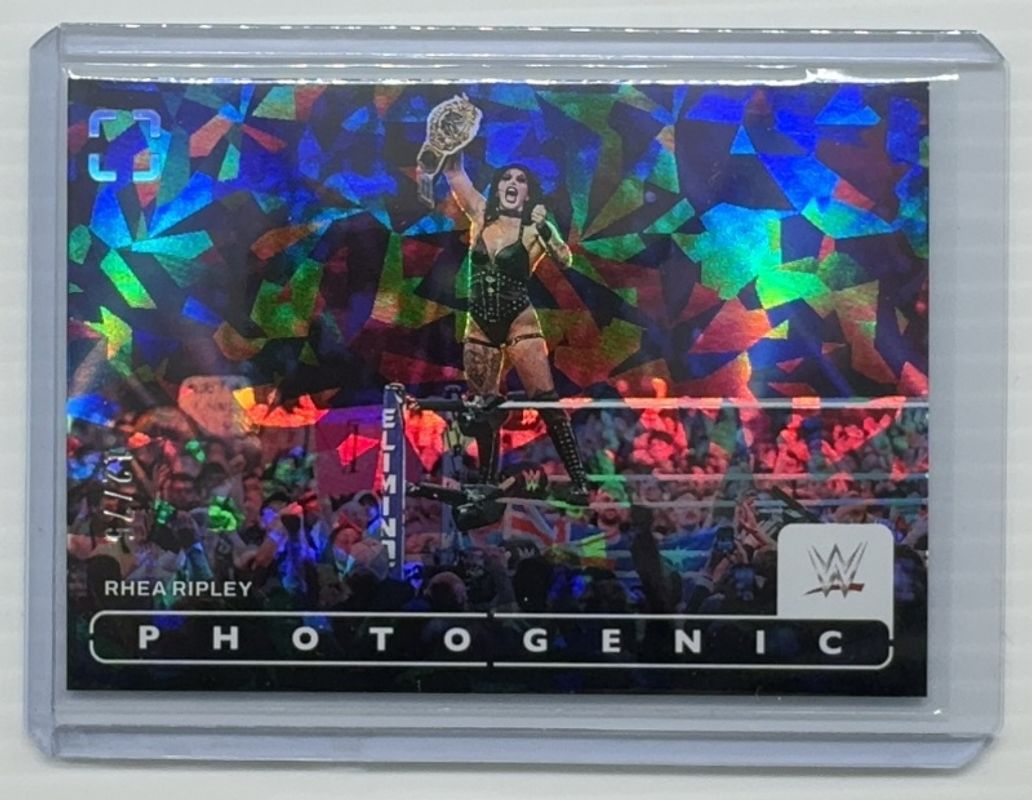 The Rhea Ripley 2024 Photogenic WWE #75 Diamond /75 card is 1 of 27 Rhea Ripley's card variations in the 2024 Photogenic WWE set being tracked by Sports Card Investor, including Base, Silver /99, Wedges /49, Maze /25, and Gold /10.