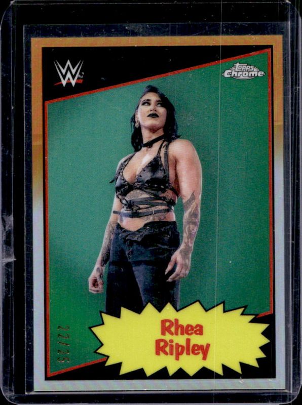 The Rhea Ripley 2025 Topps Chrome WWE #85TC-RR 1985 Current - Orange Refractor /25 card is 1 of 101 Rhea Ripley's card variations in the 2025 Topps Chrome WWE set being tracked by Sports Card Investor, including Base, Black & Gold Refractor, Geometric Refractor, Neon Green & Black Refractor, and Pink Shimmer Refractor.