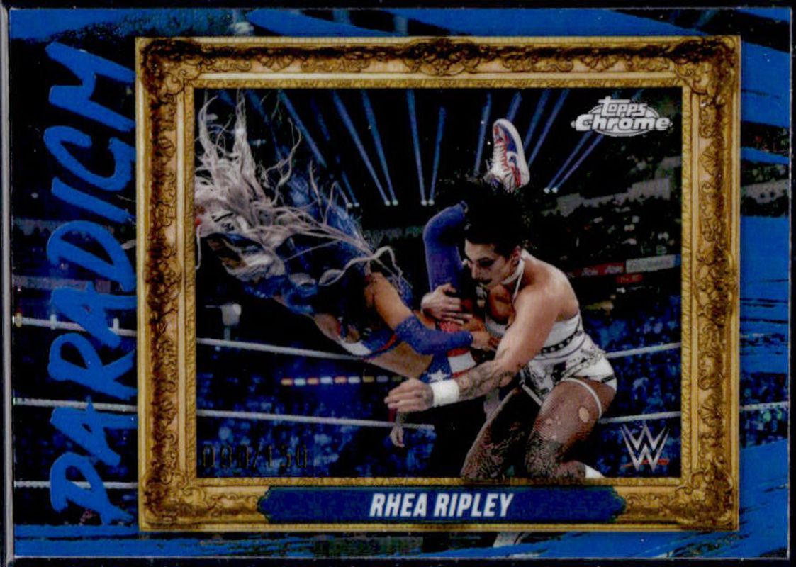 The Rhea Ripley 2025 Topps Chrome WWE #PAR-RRY Paradigm - Blue Refractor /150 card is 1 of 101 Rhea Ripley's card variations in the 2025 Topps Chrome WWE set being tracked by Sports Card Investor, including Base, Black & Gold Refractor, Geometric Refractor, Neon Green & Black Refractor, and Pink Shimmer Refractor.