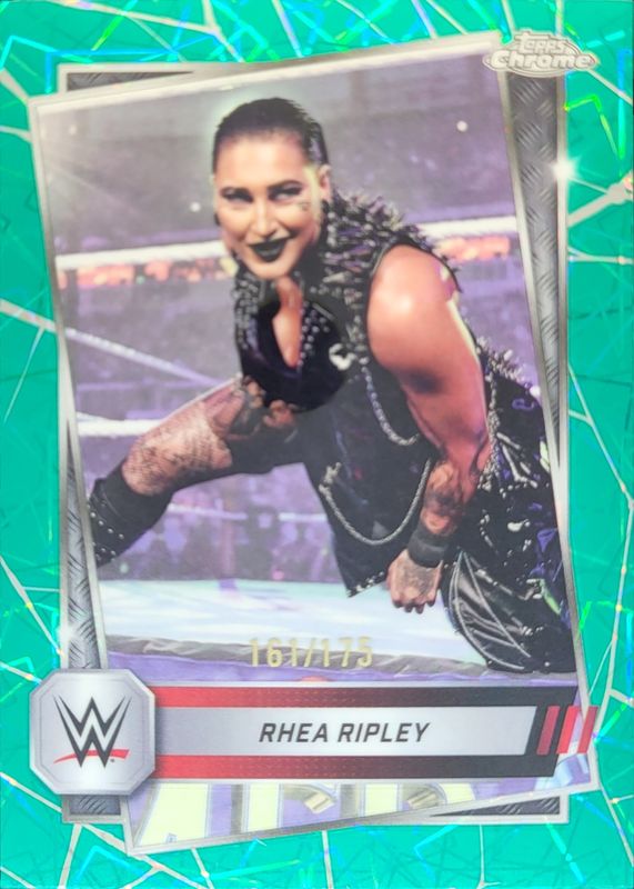 The Rhea Ripley 2025 Topps Chrome WWE #80 Teal Lazer Refractor /175 card is 1 of 101 Rhea Ripley's card variations in the 2025 Topps Chrome WWE set being tracked by Sports Card Investor, including Base, Black & Gold Refractor, Geometric Refractor, Neon Green & Black Refractor, and Pink Shimmer Refractor.