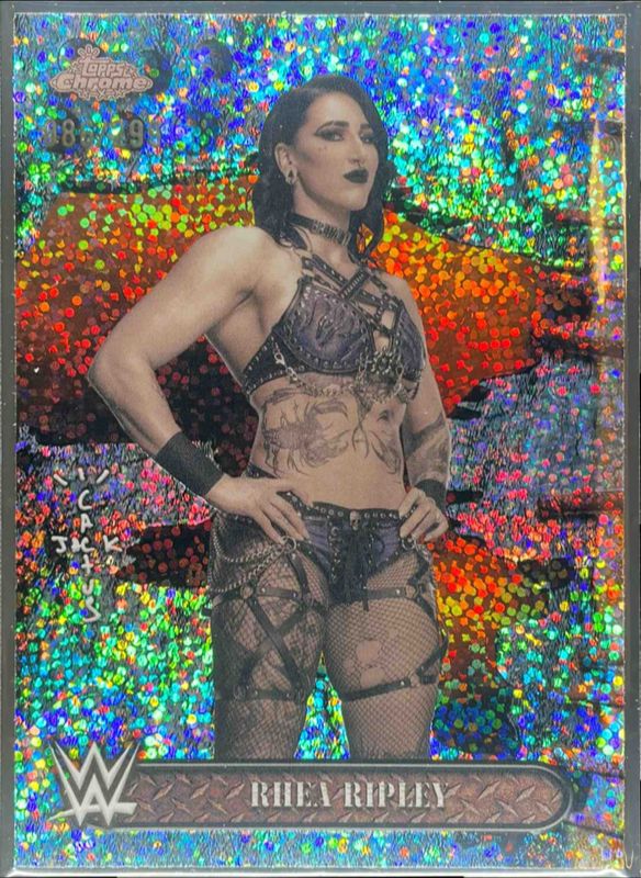 The Rhea Ripley 2025 Topps Chrome WWE x Cactus Jack #2 Speckle Refractor /299 card is 1 of 53 Rhea Ripley's card variations in the 2025 Topps Chrome WWE x Cactus Jack set being tracked by Sports Card Investor, including Base, Black & Yellow Refractor, Red & Black Refractor, Refractor, and White Refractor.