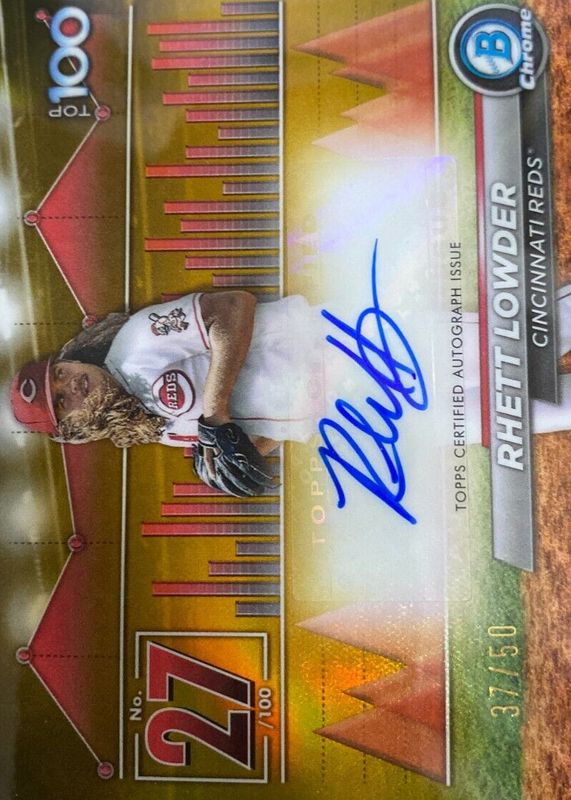 Best Prices Available For Sale of Rhett Lowder 2024 Bowman #BTPA-27 Bowman Scouts' Top 100 Autographs - Gold Refractor /50