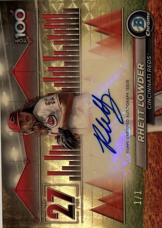 The Rhett Lowder 2024 Bowman #BTPA-27 Bowman Scouts' Top 100 Autographs - Superfractor /1 card in Raw condition has not changed in price in the last 30 days and was last sold for $255.00 .