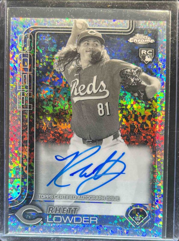 The Rhett Lowder 2025 Topps Chrome #RA-RL Rookie Autographs - B&W Mini-Diamond Refractor card is 1 of 98 Rhett Lowder's card variations in the 2025 Topps Chrome set being tracked by Sports Card Investor, including Base, Geometric Refractor, Lightboard Logo Variation, Negative Refractor, and Prism Refractor.