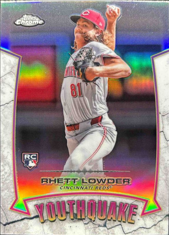 The Rhett Lowder 2025 Topps Chrome #YQ-9 Youthquake Rookie card is 1 of 98 Rhett Lowder's card variations in the 2025 Topps Chrome set being tracked by Sports Card Investor, including Base, Geometric Refractor, Lightboard Logo Variation, Negative Refractor, and Prism Refractor.