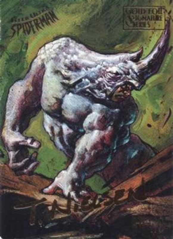 The Rhino 1995 Fleer Ultra Spider-Man #45 Gold Foil Signatures Series card is 1 of 3 Rhino's card variations in the 1995 Fleer Ultra Spider-Man set being tracked by Sports Card Investor, including Base, and ClearChrome.
