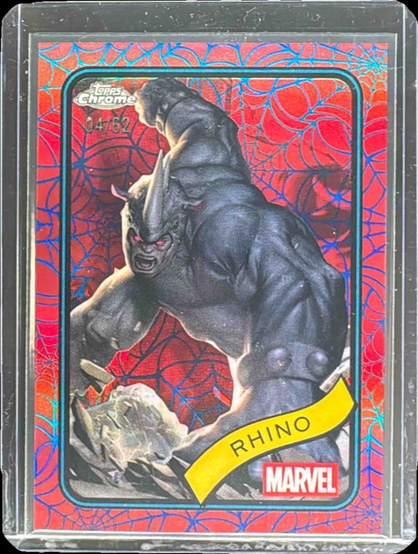 The Rhino 2025 Topps Chrome #39 Blue & Red Spider Web Refractor /62 card is 1 of 23 Rhino's card variations in the 2025 Topps Chrome set being tracked by Sports Card Investor, including Base, Refractor, Yellow Lava Refractor, Spider Web Refractor /399, and Blue Refractor /299.