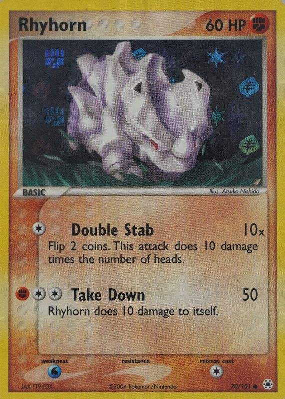 The Rhyhorn 2004 EX: Hidden Legends #070/101 Base card in Raw TCG (Near Mint) condition has moved up $3.03 (+154%) in the last 30 days and was last sold for $5.00 .