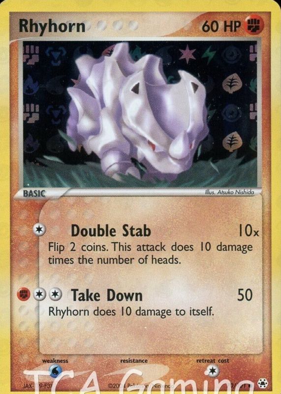 This card is 1 of 2 Rhyhorn's card variations in the 2004 EX: Hidden Legends set being tracked by Sports Card Investor, including Base.