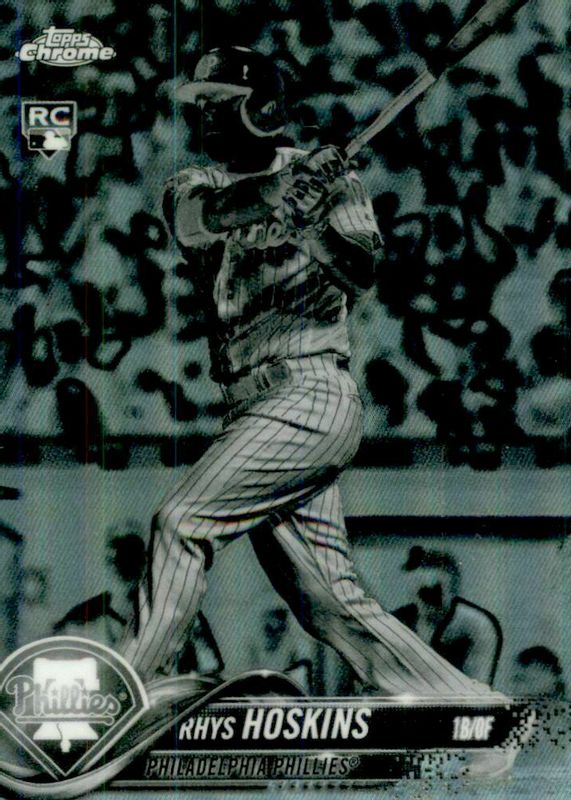 The Rhys Hoskins 2018 Topps Chrome #70 Negative Refractor (Batting) Rookie card in Raw condition has not changed in price in the last 30 days and was last sold for $1.99 .