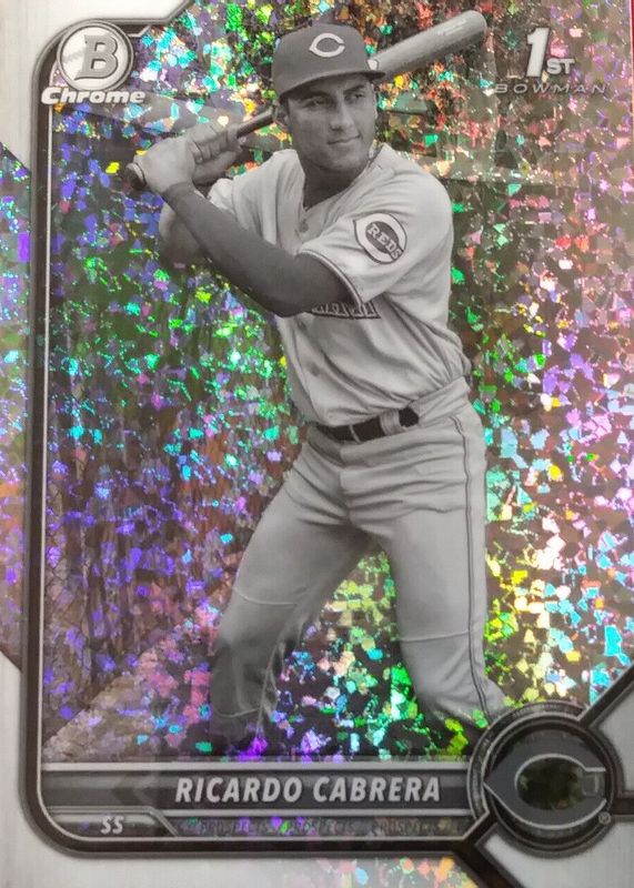 This card is 1 of 47 Ricardo Cabrera's card variations in the 2022 Bowman Chrome set being tracked by Sports Card Investor, including Prospects (1st), Prospects - Shimmer Refractor (1st), Prospects - Refractor /499 (1st), Prospects - Speckle Refractor /299 (1st), and Prospects - Purple Refractor /250 (1st).
