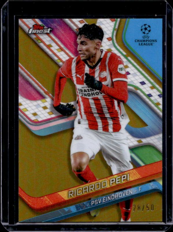 The Ricardo Pepi 2024 Topps Finest UEFA Club Competitions #118 Gold Refractor /50 card is 1 of 18 Ricardo Pepi's card variations in the 2024 Topps Finest UEFA Club Competitions set being tracked by Sports Card Investor, including Base, Refractor, Purple Refractor /299, Sky Blue Refractor /275, and Pink RayWave Refractor /250.