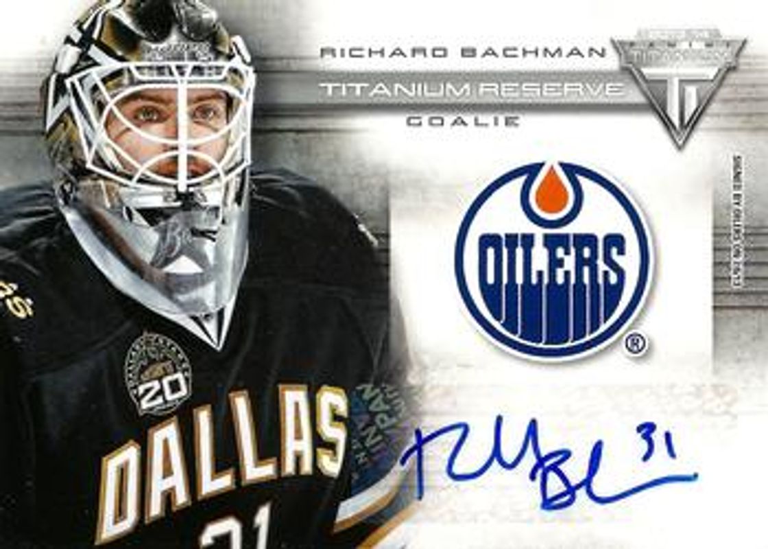 The Richard Bachman 2013 Titanium #TR-RIB Titanium Reserve card is 1 of 5 Richard Bachman's card variations in the 2013 Titanium set being tracked by Sports Card Investor, including Social Signatures, Game Worn Gear Autographs /50, Game Worn Gear Autographs Prime /25, and Game Worn Gear Autographs Patch /10.