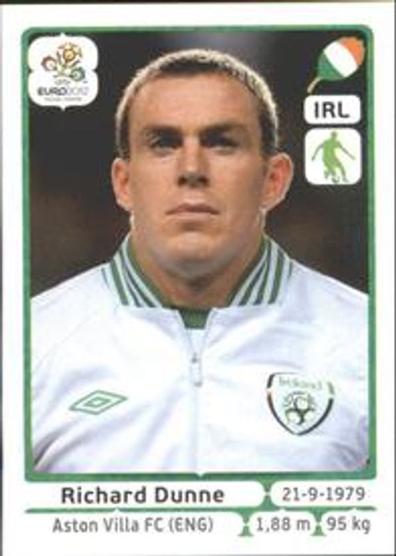 The Richard Dunne 2012 UEFA Euro Stickers #347 Base card is 1 of 4 Richard Dunne's card variations in the 2012 UEFA Euro Stickers set being tracked by Sports Card Investor, including #365 Base, #347 German, and #365 German.
