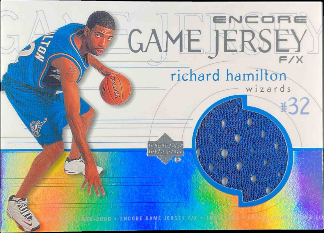 The Richard Hamilton 1999 Upper Deck Encore #RH-J Game Jerseys Rookie card is 1 of 2 Richard Hamilton's card variations in the 1999 Upper Deck Encore set being tracked by Sports Card Investor, including Base /1999.