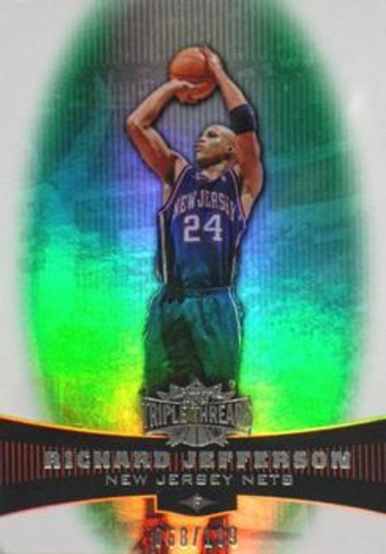 The Richard Jefferson 2006 Topps Triple Threads #70 Emerald /50 card is 1 of 10 Richard Jefferson's card variations in the 2006 Topps Triple Threads set being tracked by Sports Card Investor, including Base /99, Sepia /299, Gold /25, Sapphire /10, and Platinum /1.