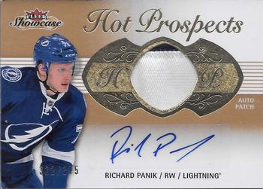 The Richard Panik 2013 Fleer Showcase #165 Base /175 Rookie card is 1 of 3 Richard Panik's card variations in the 2013 Fleer Showcase set being tracked by Sports Card Investor, including Red Glow /27, and White Hot /3.
