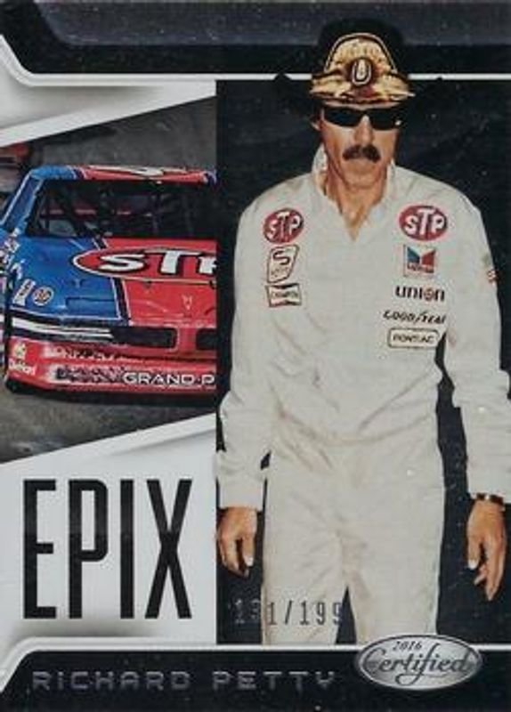 The Richard Petty 2016 Certified NASCAR #E18 Epix /199 card is 1 of 48 Richard Petty's card variations in the 2016 Certified NASCAR set being tracked by Sports Card Investor, including Base /99, Mirror Red /25, Mirror Blue /20, Mirror Gold /15, and Mirror Orange /15.
