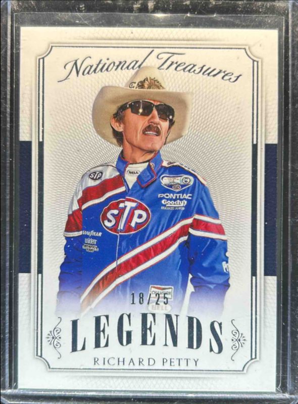 The Richard Petty 2016 National Treasures NASCAR #37 Base /25 card is 1 of 27 Richard Petty's card variations in the 2016 National Treasures NASCAR set being tracked by Sports Card Investor, including #34 Base /25, #34 Century Silver /20, #37 Century Silver /20, #37 Century Gold /15, and #34 Century Gold /15.