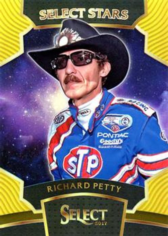 The Richard Petty 2017 Select NASCAR #S1 Select Stars Gold /10 card is 1 of 17 Richard Petty's card variations in the 2017 Select NASCAR set being tracked by Sports Card Investor, including Base, White /50, Tie-Dye /24, Gold /10, and Black /3.