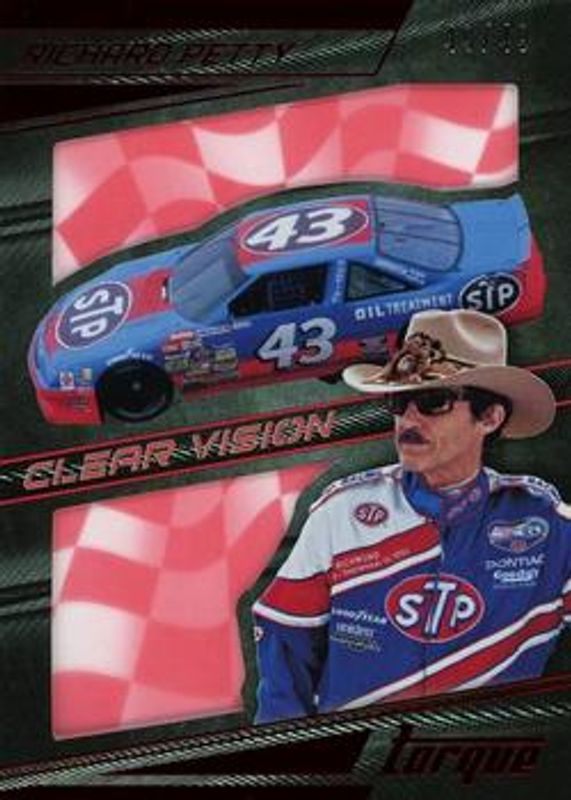 The Richard Petty 2017 Torque NASCAR #36 Clear Vision Red /49 card is 1 of 47 Richard Petty's card variations in the 2017 Torque NASCAR set being tracked by Sports Card Investor, including Base, Gold, Blue /150, Red /100, and Artist Proof /75.