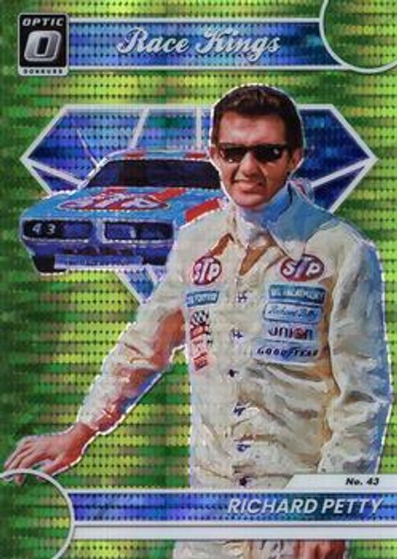 The Richard Petty 2023 Donruss NASCAR #1 Optic Lime Green Pulsar card is 1 of 158 Richard Petty's card variations in the 2023 Donruss NASCAR set being tracked by Sports Card Investor, including #159 Base, #74 Base, #37 Base, #1 Base, and #1 Carolina Blue.