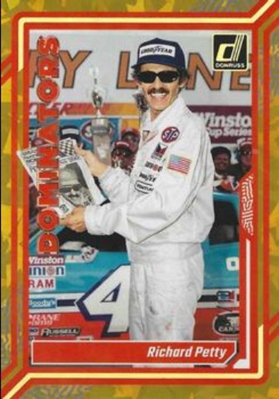 The Richard Petty 2024 Donruss NASCAR #1 Dominators Gold Ice /10 card is 1 of 99 Richard Petty's card variations in the 2024 Donruss NASCAR set being tracked by Sports Card Investor, including #17 Base, #191 Base, #17 Optic, #191 Optic, and #17 Optic Black Pandora.