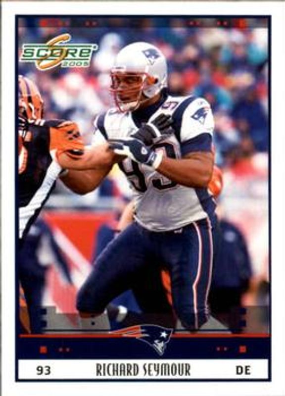 The Richard Seymour 2005 Score #170 Base card is 1 of 6 Richard Seymour's card variations in the 2005 Score set being tracked by Sports Card Investor, including Glossy, Scorecard /599, Adrenaline /399, Revolution /199, and Final Score /17.