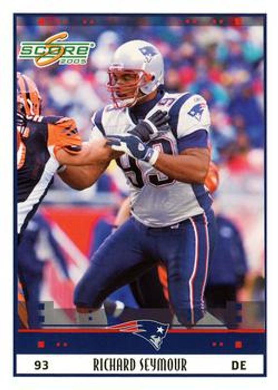 The Richard Seymour 2005 Score #170 Glossy card is 1 of 6 Richard Seymour's card variations in the 2005 Score set being tracked by Sports Card Investor, including Base, Scorecard /599, Adrenaline /399, Revolution /199, and Final Score /17.