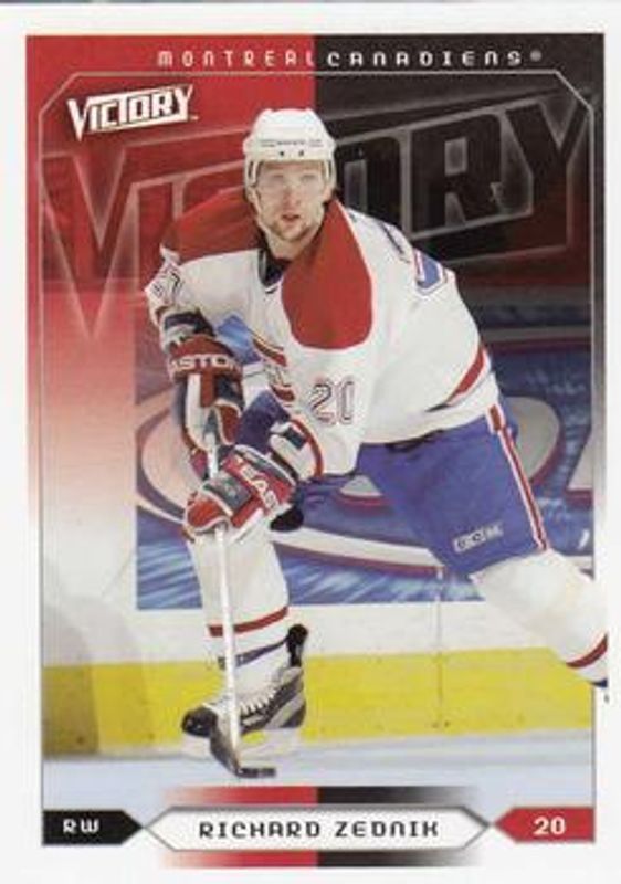 The Richard Zednik 2005 Upper Deck Victory #107 Base card is 1 of 4 Richard Zednik's card variations in the 2005 Upper Deck Victory set being tracked by Sports Card Investor, including Silver /250, Gold /100, and Black /5.
