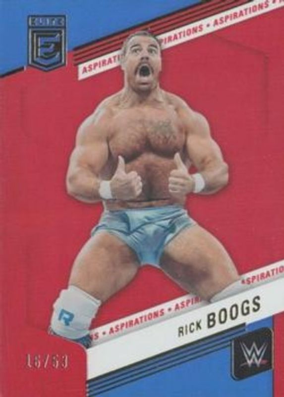 The Rick Boogs 2023 Elite WWE #83 Aspirations /53 card is 1 of 20 Rick Boogs' card variations in the 2023 Elite WWE set being tracked by Sports Card Investor, including Base, Green, Pink, Razzle Dazzle, and Red.