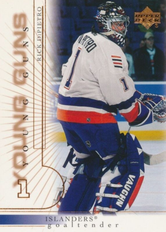 This card is 1 of 3 Rick DiPietro's card variations in the 2000 Upper Deck set being tracked by Sports Card Investor, including Young Guns - UD Exclusives Tier 1 /100, and Young Guns - UD Exclusives Tier 2 /25.