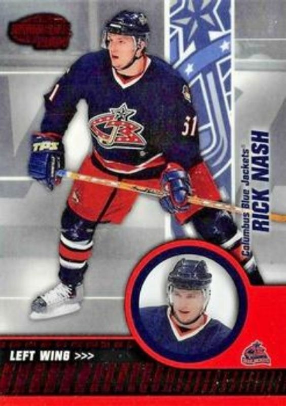 The Rick Nash 2003 Pacific Invincible #28 Red /850 card is 1 of 6 Rick Nash's card variations in the 2003 Pacific Invincible set being tracked by Sports Card Investor, including Base /799, Retail, Blue /350, Featured Performers, and New Sensations.