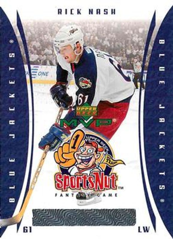The Rick Nash 2003 Upper Deck MVP #SN26 SportsNut card is 1 of 7 Rick Nash's card variations in the 2003 Upper Deck MVP set being tracked by Sports Card Investor, including Base, Silver Script /150, Gold Script /25, Red Script /25, and Winning Formula.